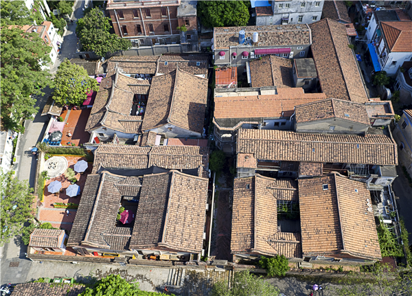 鼓浪屿的四落大厝,是指岩仔脚聚落留存下来的四组红砖厝建筑物组合的民间建筑。它们于19世纪20至40年代,即清嘉庆、道光年间,由黄有山、黄勗斋、黄崑石祖孙三代及族人建设,是鼓浪屿现在保存下来规模最大、最完整的一组闽南红砖厝建筑群。占地面积3100多平方米,建筑面积1600多平方米。四落大厝布局上遵循着中国传统的风水理念,背靠日光岩山坡,面向厦门方向鹭江(海峡)海岸的田地。目前较完整地留存下来的四座院落分别是靠东北的中华路25 号,靠东南的中华路23号,靠西南的海坛路35至39号,靠西北的海坛路33号。中华路25号是黄勗斋长子黄崑石的住宅,第一落(进)正房挂“大夫第”匾额,是两落(两进)三开间带护厝(厢房)的院落。中华路23号是与中华路25号同期建成的院落。海坛路33号,是两落三开间右侧带护厝的院落,其护厝经过近代的改造,在原有砖墙结构基础上加高一层,加高的部分采用洋楼“叠楼”的做法。另外,建筑背后的西南角又加建了三层高的窄长洋楼。海坛路35至39号,是近代经改造的红砖厝的珍贵实例,这是一座第一落(前屋)三开间,第二落(后屋)五开间,两侧带护厝的院落,特别的是,除第一落外,其他各部分都在近代经过洋楼化的“叠楼”改造,其中第二落改为两层的“叠楼”,朝向背后,设置了五开间的梁柱式外廊,左侧的护厝在东北角朝向海坛路33号房前的窄厝埕,设置了八角形平面突出的带圆弧拱券的两层“叠楼”,与海坛路33号红砖厝的传统立面形成鲜明的对比。