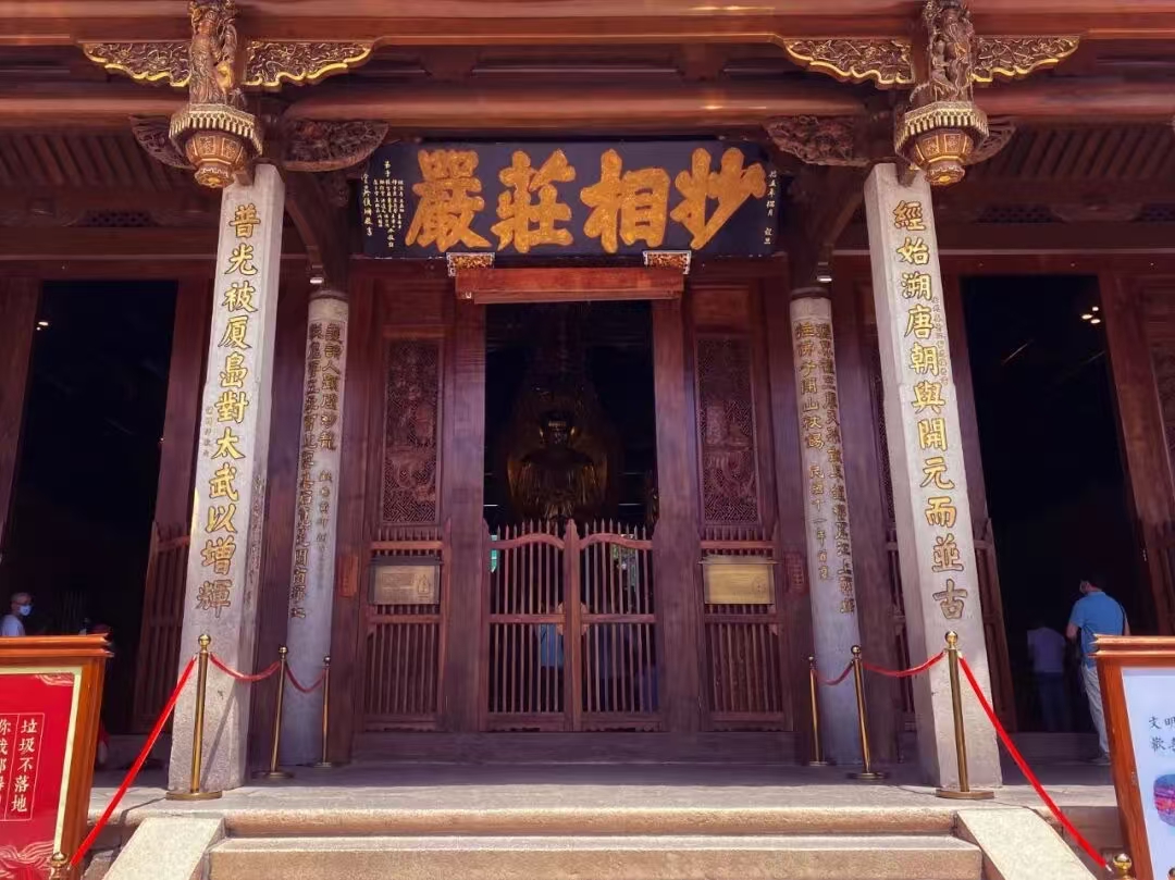 大雄宝殿是整个寺院的中心,具有典型的闽南佛殿的特点,大殿正中供奉三世尊佛高大的塑像,殿后供奉西方三圣。大悲殿呈八角形三重飞檐,中间藻井由斗拱层层迭架而成,无一根铁钉,构造极其精巧;殿内正中奉祀观音菩萨,其余各面为48臂观音,造型优美、姿态多样;又因闽南信众均崇奉观音菩萨,所以此殿香火异常鼎盛。