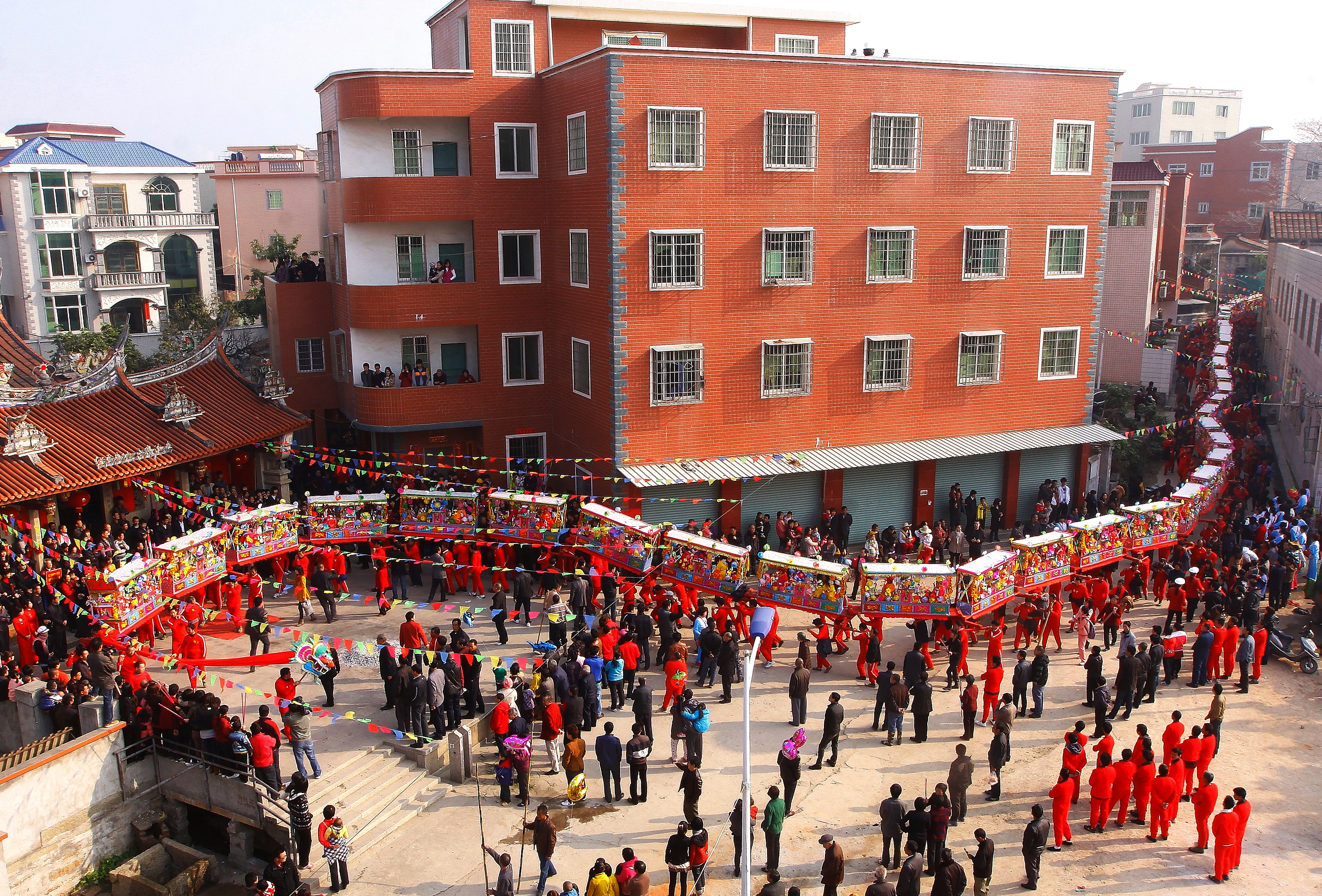 每一阁棚由两个或四个甚至八个成年男子扛抬,几十节阁棚相连。活动时,蜈蚣阵由人力肩扛或装轮推动,由少年儿童扮成《西游记》《三国演义》等各种戏曲人物在棚上表演,配以富有闽南地方特色的音乐和一定的节奏和队形,犹如一条蜈蚣在地上蜿蜒爬行。缓缓行进中,一路放鞭炮,一路表演,十分壮观。