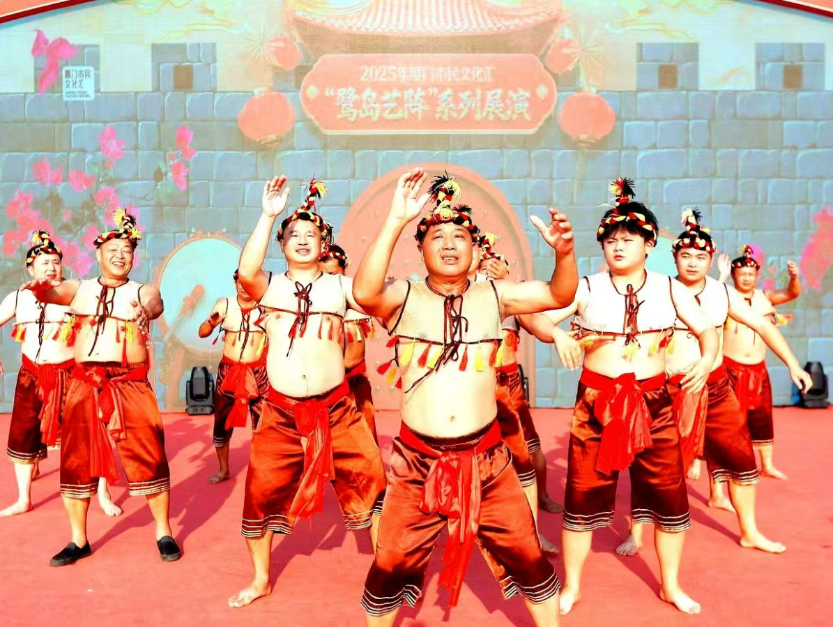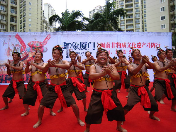“拍胸”,亦称“打花草”,也叫“打七响”“乞食舞”等,广泛流传于福建南部沿海地区,尤以泉州、厦门为盛,是广大群众喜闻乐见的一种民间艺术形式,被称为远古舞蹈活化石。