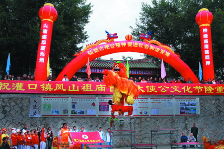 该信俗从明末清初就传至中国台湾、马来西亚、印尼、泰国等地,其节日有农历三月初七的年祭和五月初四大使公圣诞,每逢这两个节日,各方善信云集上香,形成了独具特色的祭拜仪式和进香阵头赛会的习俗,各种民俗表演和文化活动高潮迭起,精彩纷呈。凤山庙也成为海内外广大信众前来祭祖、朝圣的圣地。清雍正乾隆年间,灌口銮井(陈井)陈姓,大批迁居中国台湾,衍繁成为三重、彰化、嘉义、云林的望族,所携家乡保护神香火,现祀奉灌口凤山庙大使公的分炉有160余座。认同凤山庙为祖庙的信徒约有25万人以上,最大的庙是嘉义县鹿草乡圆山宫。