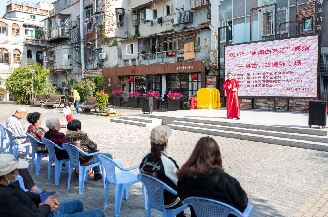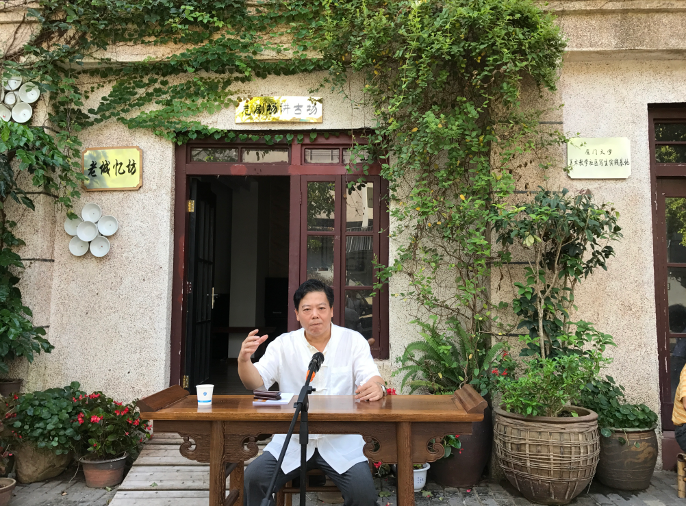 据清道光《厦门志》载:“说平话者,绿荫树下,古佛寺前,称说汉、唐以来遗事。众人环听,敛钱为馈,可使愚顽不识字者为兴感之用……”说明昔时厦门“闽南话讲古”早已存在,至少在清代已相当鼎盛,还出现了职业民间艺人,闽南人称之为“讲古仙”,在一些宫庙、市场和街道里巷,都有固定或临时的“讲古场”,民间多叫做“茶桌仔”。讲古内容无所不有,像《封神榜》《三国演义》《水浒传》《西游记》《说唐》《包公》《陈世美》以及地方传奇如平闽十八洞、闽王王审知、陈三五娘等。讲古人多在讲古场里放一茶桌,上置茶具,手执书本或折扇,有的还放一块醒木,讲者渴时可泯口茶,凭着生动的闽南话语汇,用富有变化的各种语气和面部表情以及肢体动作,绘声绘色地“讲古”,引人入胜,令听众喝彩。