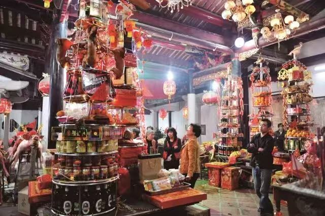 三是“祖瓯”,也叫“装山”,由具有四代男性长者家承办,供品简单,可与工艺品搭装,制成高山流水,鸟语花香的形体,意为寿比南山。