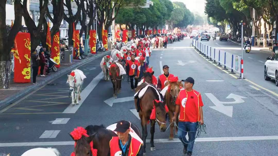 马队迎王仪式源于纪念“张府王爷”张巡(709—757年)。张巡在唐朝“安史之乱”中为保卫大唐江山英勇殉职,被历代朝廷赐封为“护国英雄”,因其“精忠贯日月”被供奉为“护国尊王”。千百年来信众祀奉朝拜,其信仰传入同安,入住同安溪边龙虎宫,尊为“张府王爷”。张府王爷成神后,继续庇佑乡民,每逢闰年农历六至十月开展“北巡活动”,代天巡狩、惩恶扬善,为民造福,亦被尊称为“北巡王”。闰年农历十月中旬,同安溪边社区信众举行大规模“迎驾”活动,迎接“北巡王”凯旋。据传张王出巡时,要靠大量马匹运载货物(实是古代南北物资交流)。所以当地信众组织百匹马队,每匹马都头插金花,鞍披红毯,颈挂铜铃。浩浩荡荡,蔚为大观,当地称之“看马”。群众用这种仪式来弘扬扬善抑恶、忠贞爱国的人文精神。龙虎宫口古为通往金门、台湾的码头。故每逢“看马年”,不少金门、台湾信众也都热心参与。因此,龙虎宮(原名碧溪殿)被列为厦门市涉台文物古迹。