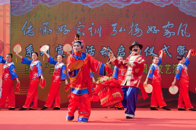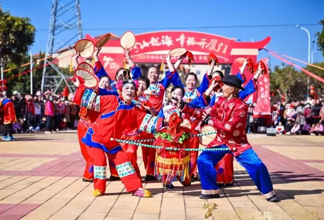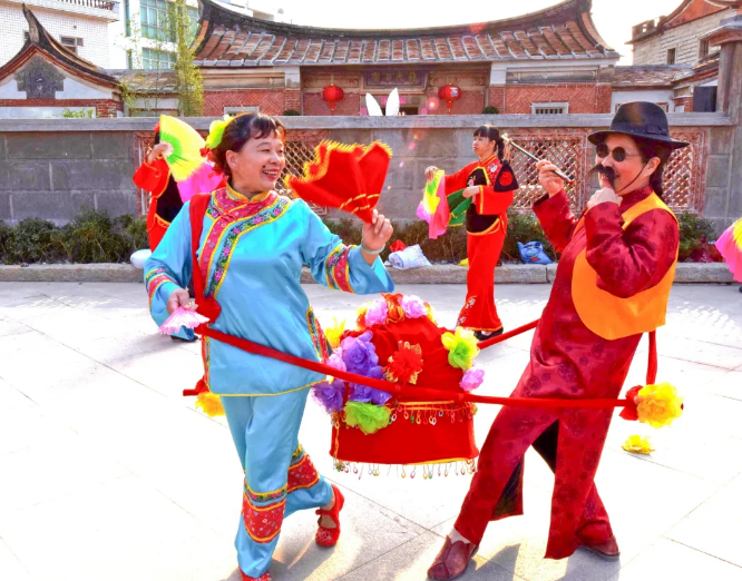 车鼓弄是集说唱、表演合一的民间歌舞艺术。它源于汉代的“笳鼓”(谐音“车鼓”),是古代弄戏的遗存形式。“车”就是翻转,“弄”就是舞弄之意,又有“弄车鼓”的俗称。关于车鼓弄的来历,闽南地区流传着“磨豆夫妻逗唱”“武装劫救”“丰收庆贺”等几种说法。相传在明代,同安有一对开豆腐店的夫妻,夜里磨豆腐时编歌唱逗,受到邻里欢迎。老夫妇继而用装豆子的斗篮代替石磨,公婆进退欢舞,戏弄玩乐,状如推车,所以就被取名为“车鼓弄”。车鼓弄表演时,二人扮做男丑与彩旦,扛着竹篮搭扣的鼓轿,踏着四方交叉步,进三步退三步,一唱一答,妙语如珠。内容多为孝道劝善、夫妻情趣、情人相思等。