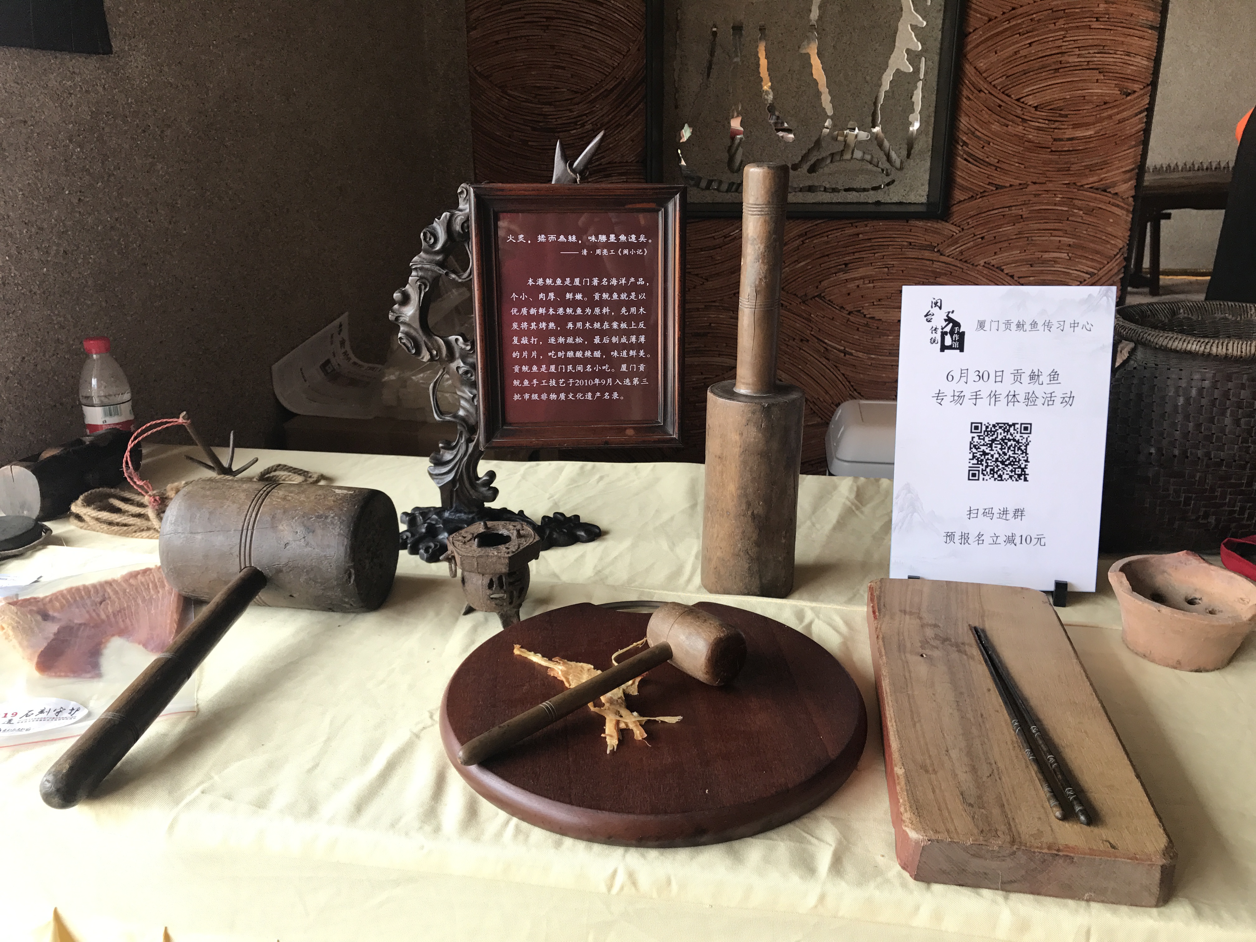 厦门贡鱿鱼手工技艺始于明末清初周亮公在《闽小记》里的记载:闽南贡鱿鱼,“火灸,揉以为丝,味胜墨鱼远矣”。贡鱿鱼是厦门地区一种名小吃,具有地方风味,在民间流传历史悠久。清朝末年,厦门人吴序傅潜心研究诸多民间贡鱿鱼技艺,在总结、传承前人经验的基础上,取百家之长,独创体现闽南海洋文化特色的传统手工技艺“福隆益”贡鱿鱼。它采用优质新鲜厦门本港鱿鱼为原料,个小、肉厚、鲜嫩。先用木炭将其烤熟,再用木槌在案板上反复敲打,逐渐疏松,最后制成薄薄的片片,吃时蘸酸辣醋,味道鲜美。“福隆益”贡鱿鱼在长期的劳动实践中,五代传人潜心钻研,坚持传统工艺,贡鱿鱼的主料、配料、保鲜绿色纯天然,无添加剂,用料考究,操作严谨。古老的做法至今仍然符合现代人对纯天然、安全、绿色放心食品的需求。2008年12月福隆益贡鱿鱼被福建省老字号协会认定为“福建百年老铺”,2010年获《厦门晚报》主办的首届 “十大最厦门伴手礼”称号。