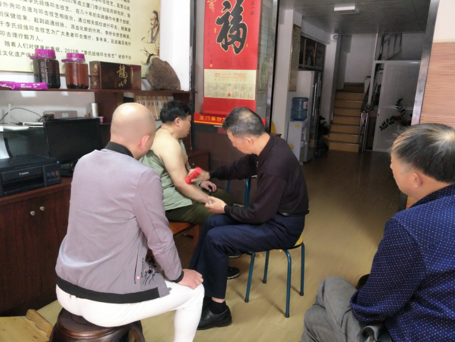 李氏叩击经络保健技艺至今有100多年历史,起源于福建泉州市,逐渐流传于厦门等闽南地区及东南亚华侨华人寄居地。李氏叩击经络保健技艺主要将全络通(祖传秘方叩击液)与叩击锤相结合,运用祖传手法,按照有节奏的力度、角度和点面结合,在人体部位进行拍打直至出痧,通过叩击使全络通从毛孔而入,加速对皮肤的渗透吸收,达到保健的效果。该技艺最早使用的是掌力和拳力,后改为羊角、木槌或木棒制成的拍子进行叩击,现为医用硅胶材质制成的经络叩击锤,在锤面、侧壁增加了凸起的小颗粒,在叩击人体部位时更能准确刺激人体穴位,起到疏通经脉、舒筋活络的保健作用。