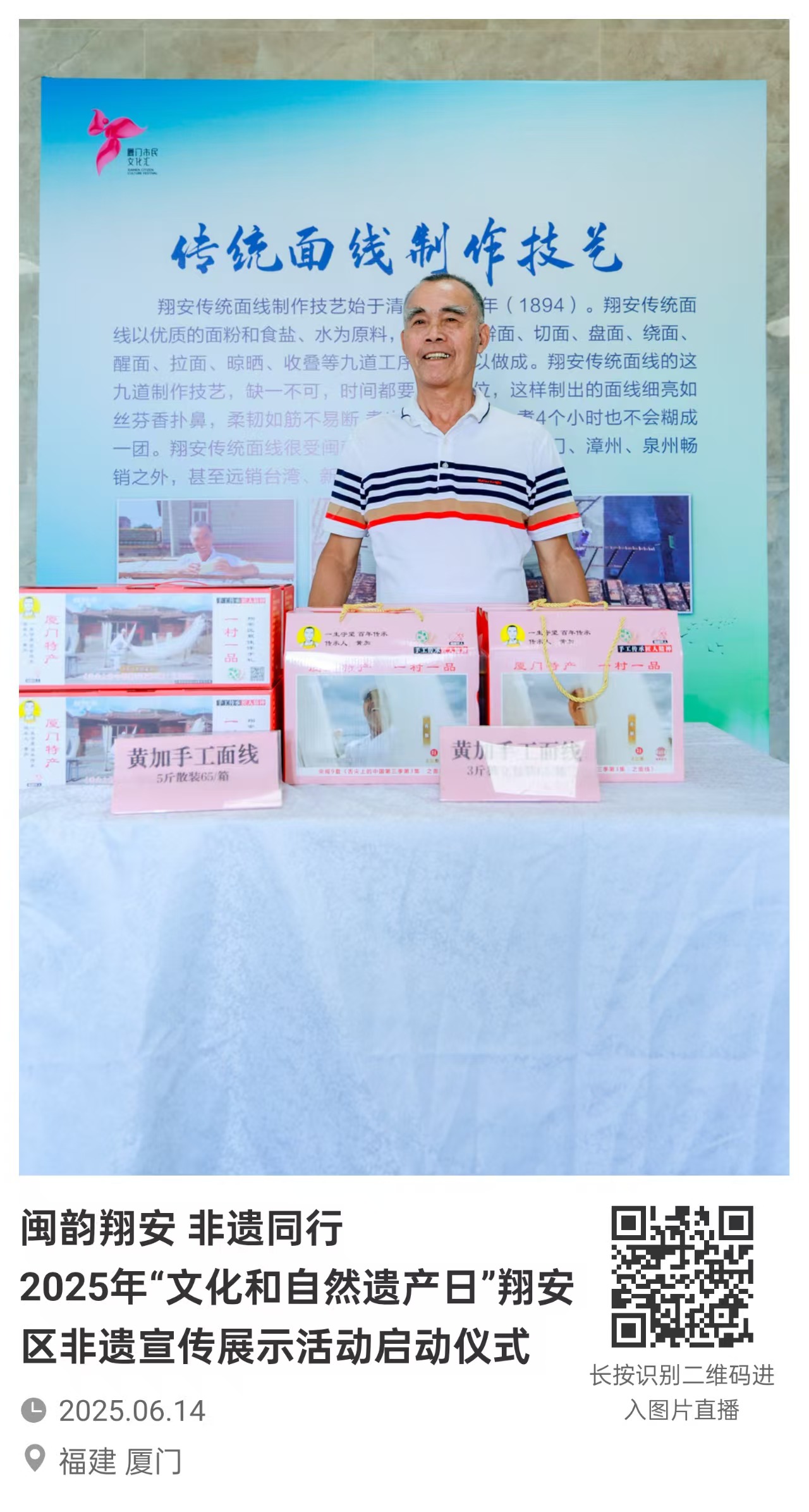 本人出生于1957年,翔安区新圩镇金柄村村民、祖辈早年是制作手工面线,,因父亲早逝差点失传、十八岁那年,我到晋江安海梧埭村向手工面线师傅吴安然拜师学艺。远古的面线传承情况已无从考究,仅从晋江安海梧埭村手工面线制作可追溯的历史算起: