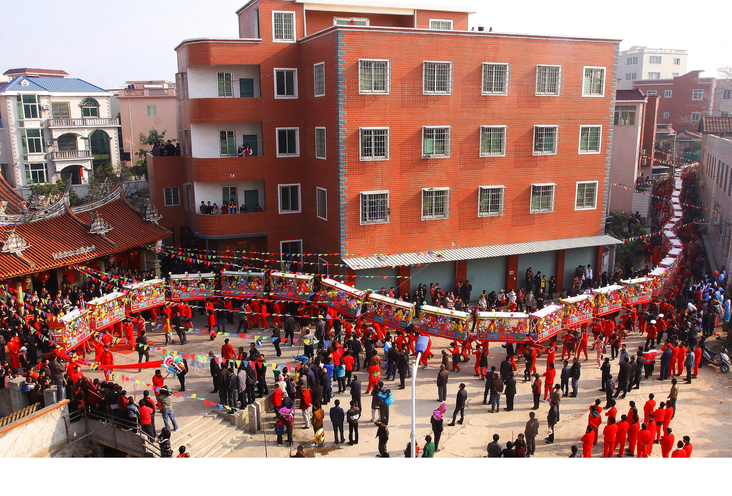 每一阁棚由两个或四个甚至八个成年男子扛抬,几十节阁棚相连。活动时,蜈蚣阵由人力肩扛或装轮推动,由少年儿童扮成《西游记》《三国演义》等各种戏曲人物在棚上表演,配以富有闽南地方特色的音乐和一定的节奏和队形,犹如一条蜈蚣在地上蜿蜒爬行。缓缓行进中,一路放鞭炮,一路表演,十分壮观。