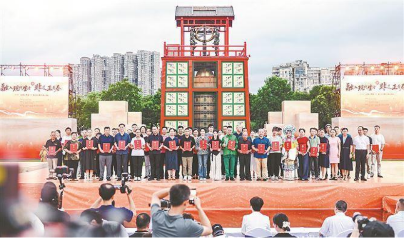 非遗代表性传承人上台领取证书。