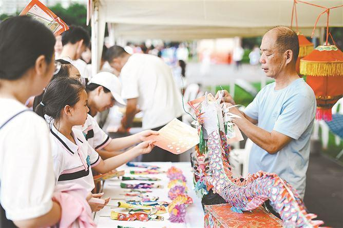 主舞台周围,一个个摊位展示着不同的非遗代表性项目:传统香制作、厦门乌龙茶传统精制技艺、闽南造像(泥塑)、传统纸扎、厦门漆线雕、厦门珠绣等。丰富的非遗技艺吸引了一拨又一拨市民围观。在非遗技艺车鼓弄摊位前,两名小学生在非遗代表性传承人的指导下,有模有样地学了起来。市民陈女士说,这种参与式的非遗体验非常好,寓教于乐,让孩子更好了解传统技艺。