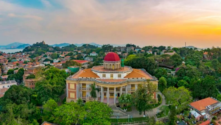 八卦楼:八卦楼坐落于鼓浪屿东北部的笔架山东北麓,俯瞰厦门港,始建于1907年,1930年穹顶封顶,历时23年,主楼建筑面积6300平方米,其体量和高度都是鼓浪屿别墅之最。独特的地理位置与曲折的建造过程,使八卦楼成为中国近代以来社会变迁的历史见证。