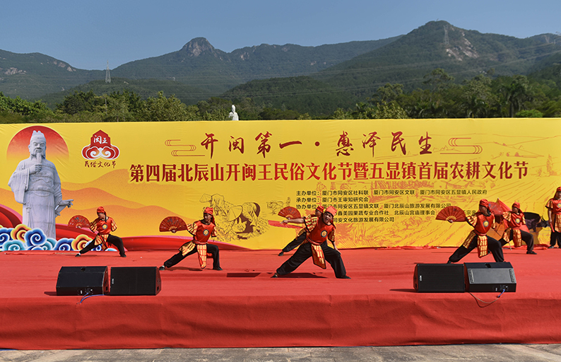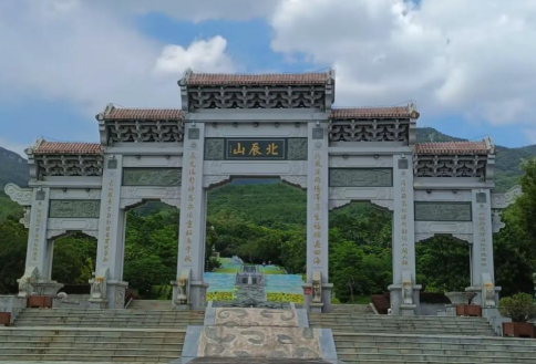 开闽广场(闽南印象广场),正面“北辰山 ”三字以及楹联是闽王的 38世裔孙台湾“立法院 ”院长王金平先生题写,是闽台宗亲敦睦的见 证!山门后面悬挂着一副匾额“八闽人祖 ”,乃宋太祖赵匡胤为表彰 闽王的功绩而御赐的封号,由同安著名书法家谢水墨先生所题写;北辰山门高18.81 米,宽 38.55 米,系 6 柱 5 门白优质花岗岩卷棚顶。