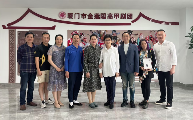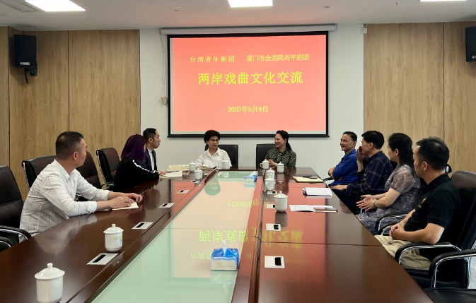 为促进海峡两岸戏曲文化交流合作、推动两岸共同传承和弘扬中华优秀传统文化,2023年5月9日下午,台湾青年剧团和厦门市金莲陞高甲剧团在闽南戏曲艺术中心开展两岸戏曲文化交流活动。厦门市金莲陞高甲剧团团长吴晶晶、书记吴敏、副团长陈炳聪、副团长王双庆、办公室主任陈复职、策划宣传室主任黄相平,台湾青年剧团团长梁月孆、经理童柏寿、胡予欣参加了活动。