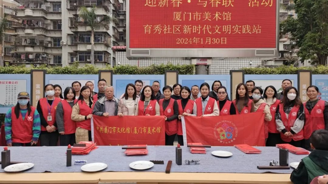 欢天喜地迎新春,书写春联送祝福。2024年1月30日下午,厦门市美术馆携7位书法家走进育秀社区,举办“文化迎春 艺术为民——厦门市美术馆迎新春·写春联活动”。