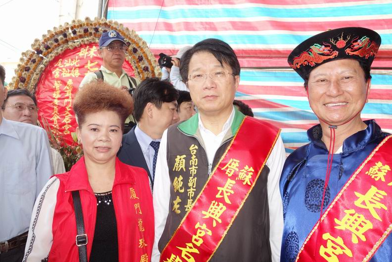 5月10日,成员们清晨4点就到达了长兴宫,参加了本次“七朝瘟王祭”的重头大戏——送王仪式,它是全台现存最传统的王船祭典,保留古制开水路、人力扛王船等传统。仪式开始后,上千信徒拉、扛2条粗绳,将王船从庙前拉出。庙方人员拿水瓢洒水,为王船开水路,一路护送王船直到曾文溪畔。台南副市长颜纯左参加了送王仪式,并与龙珠殿李葡萄理事长合影留念。