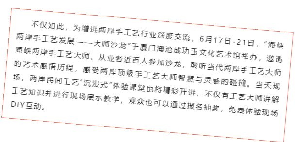 展览旨在打造展示工艺精品的平台,搭建海峡两岸文艺交流的桥梁,促进海峡两岸文化深度合作。