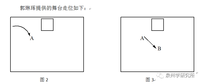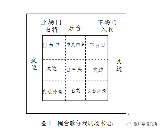 闽台歌仔戏“跳加官”的舞台走位,有同有异,但两岸剧场常用术语相同,见图1: