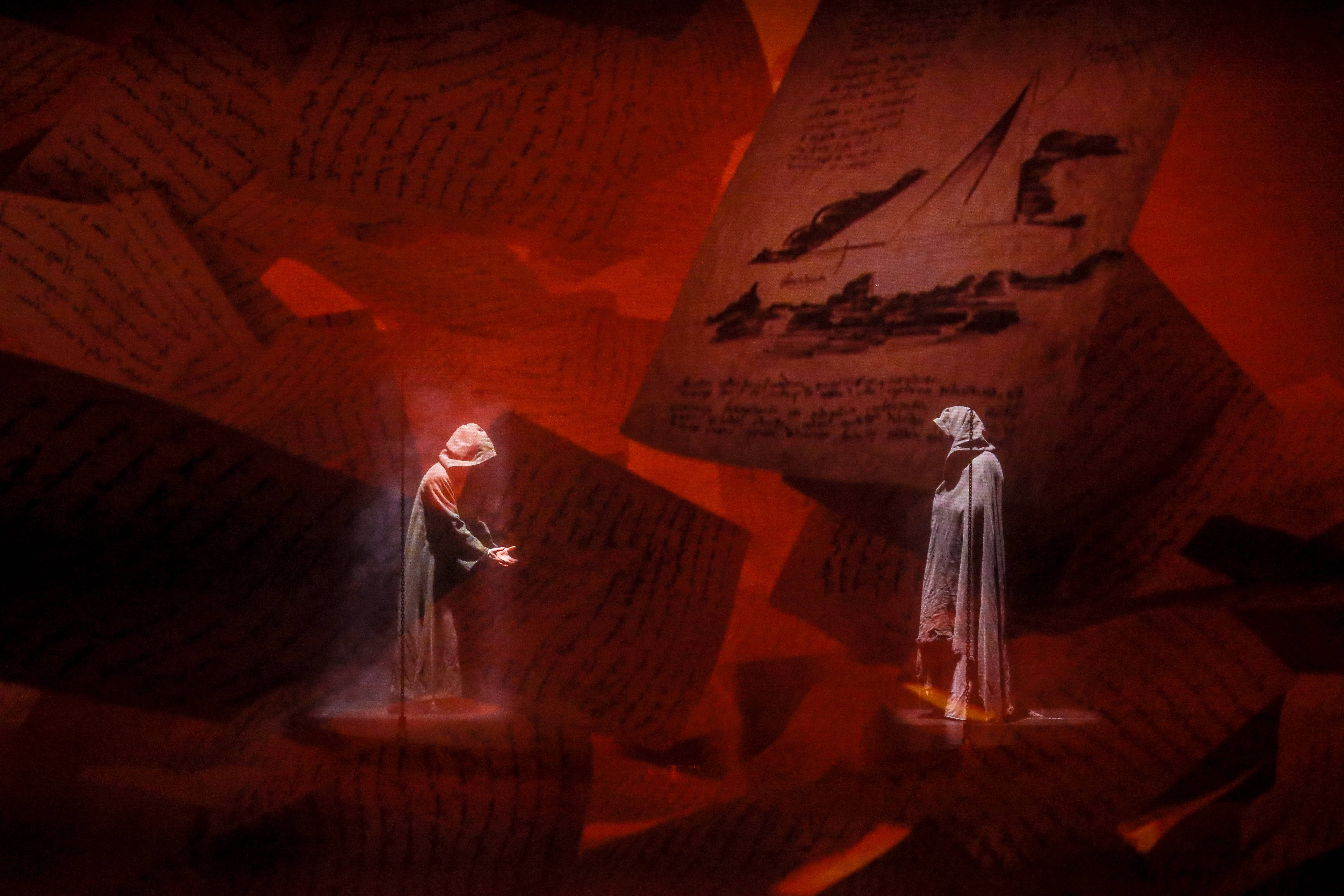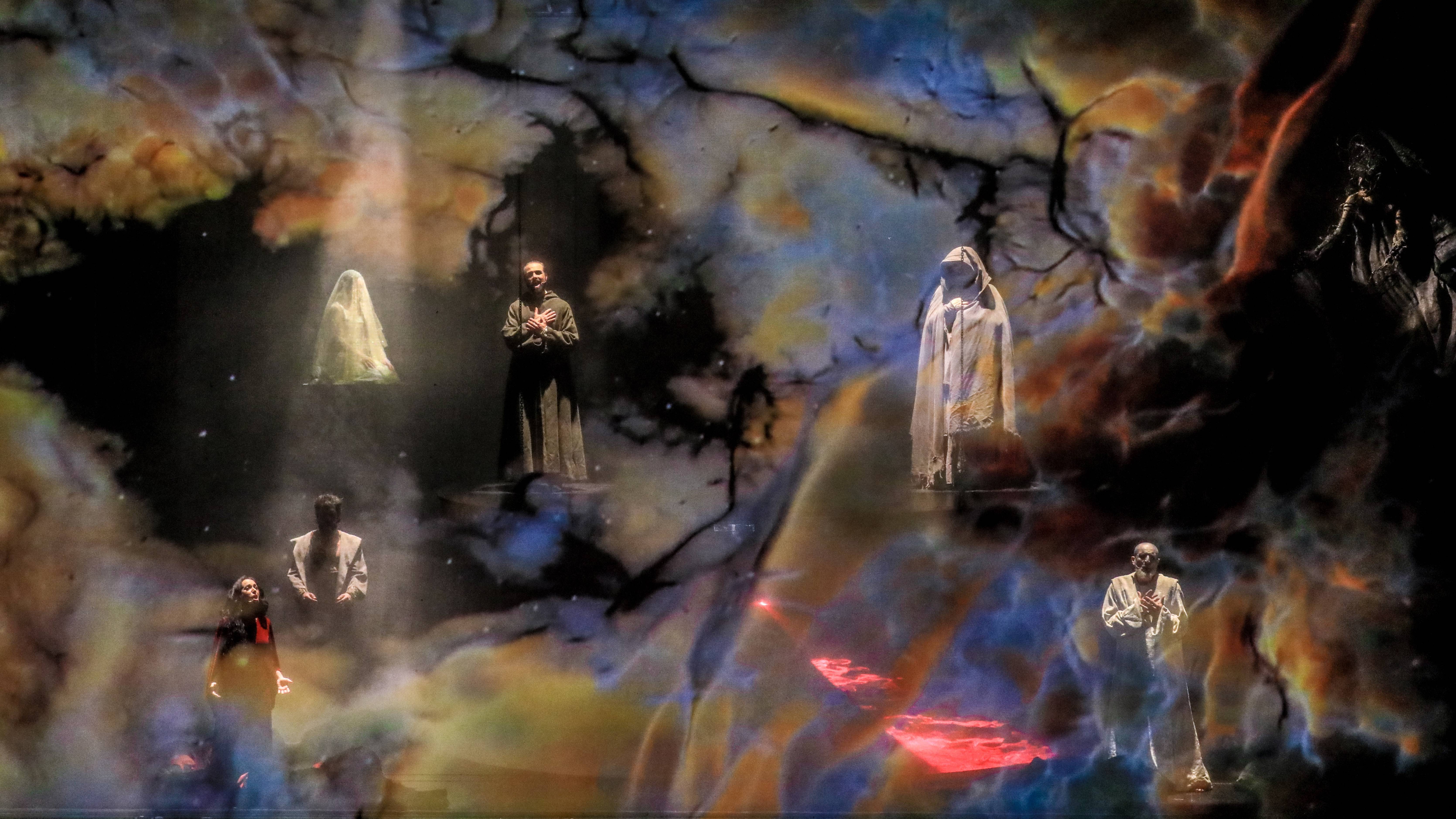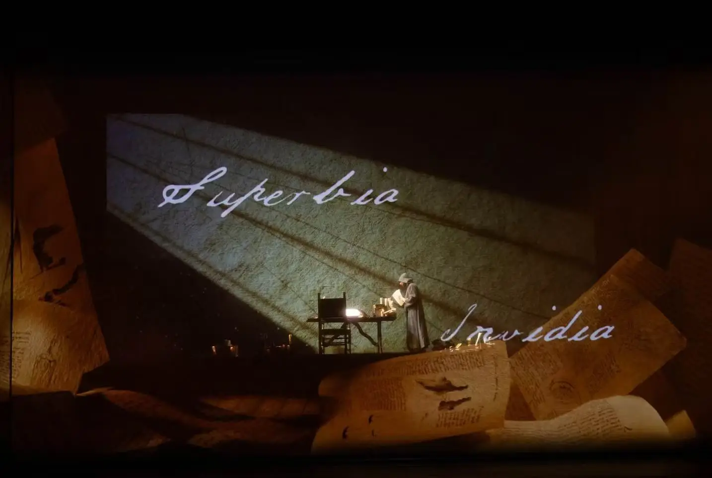 《神曲》的舞台设计不同于传统的布景,通过精心设计的机械装置与3D动态投影相结合,使得舞台空间不断变化,伴随着音效与灯光的变化,形成震撼的视觉冲击,令观众仿佛置身一座流动的剧场。团队更准备了逾两百套手工刺绣的中世纪服装与精致道具,与投影完美呼应,将中世纪的典雅与神话的奇幻完美结合,让每一个角色都仿佛从历史的画卷中走出,展现出独特的魅力。
