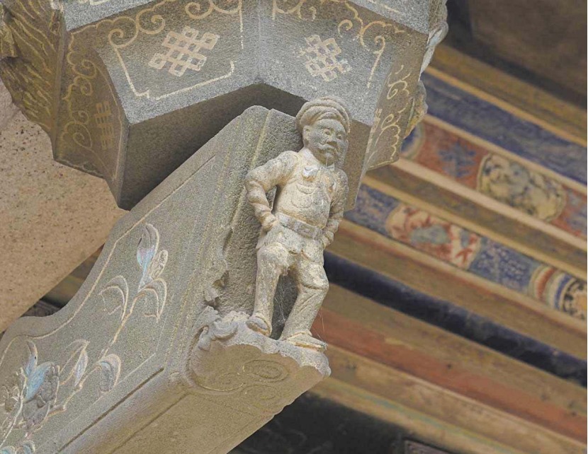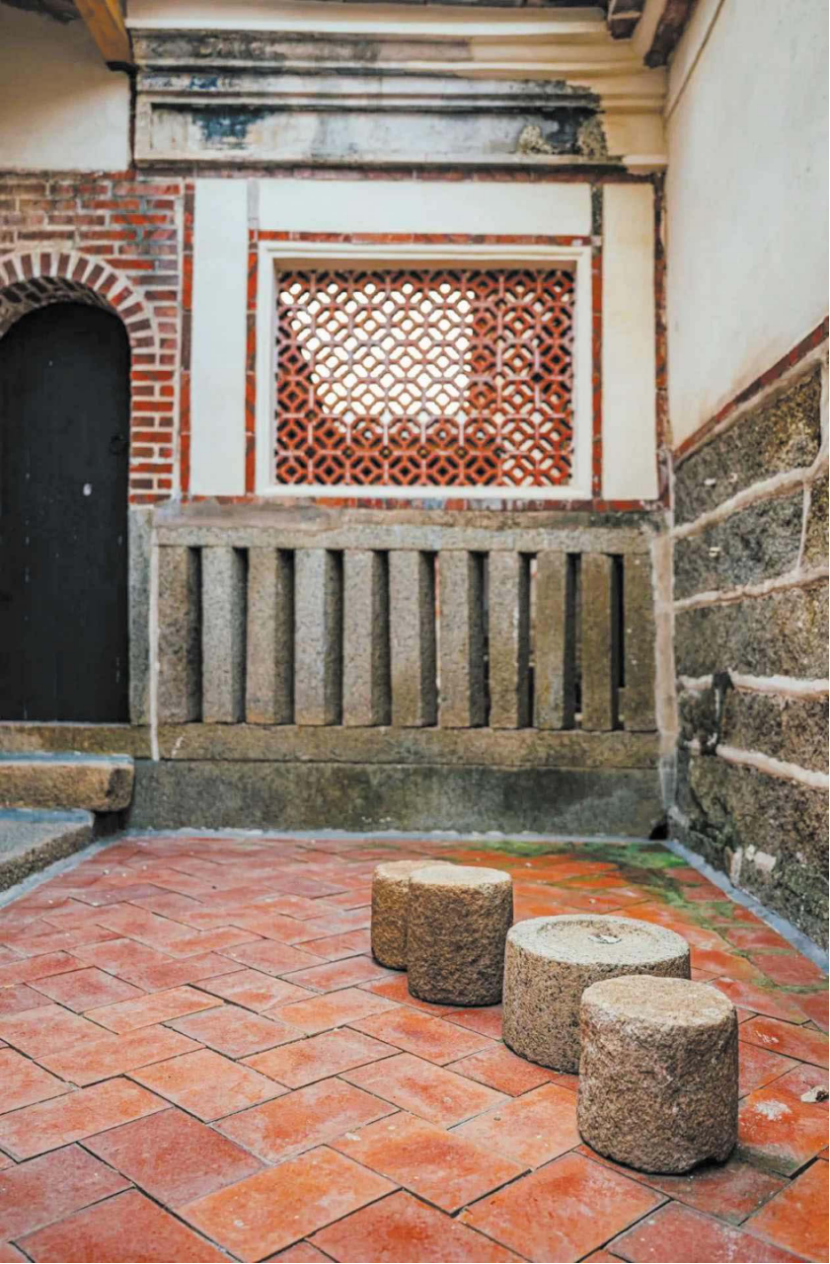 大厝里,闽南传统建筑与南洋元素碰撞交融的细节,俯拾皆是。大厝门廊墀头那对福建仅存的“蒙伽利”石雕——蓄八字胡的锡克族卫兵与戴毡帽的“番仔婆”分立两侧,异域面容是华侨跨海经商的岁月印记。莲塘别墅的外墙、廊墙、前檐墙等均采用空斗砖砌技术,几乎汇集闽南红砖民居空斗砖砌的全部图案。别墅学堂里仅存的观戏台,也十分有个性,为双脊卷棚敞开亭。