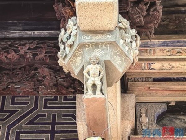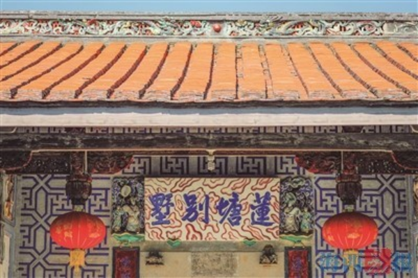 在莲花洲的建筑群中,可以清晰看见闽南传统建筑艺术与南洋文化元素的碰撞交融,该特质在细节处尤为显著。比如,莲塘大厝门廊两侧墀头上装饰有福建仅存的两尊“蒙伽利”石雕,历史价值珍贵。“蒙伽利”是近代闽南华侨建筑上出现的独特装饰物,是闽南人对外国来的护院仙灵的称谓。莲塘别墅的“蒙伽利”石雕姿态生动,男雕像头裹头巾、身着制服、双手叉腰、蓄八字胡,典型的锡克族卫兵形象;女雕像头戴毡帽、身着长裙、体形丰满,外邦女佣形象,被戏称为“番仔婆”。大厝右侧护厝屋檐下遗存有一面独特的“水车堵”,现今的“水车堵”遗存虽有残破,但还可清晰呈现“通商洋行”招牌字样,向世人彰显百年前海沧华侨下南洋放眼世界的豪情。
