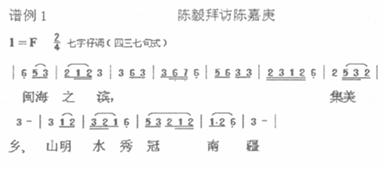 荷叶说唱以生动、形象、丰富的厦门方言讲故事、塑造人物,情节引人入胜、扣人心弦。它以歌唱为主,表叙为次,生动刻画人物和叙事,口语文词并用,对白多用口语,唱词通俗顺口。唱词句式一般为四三七字句 (如谱例1),三三四十字句,或三三五十一字句,四句为一抛( 首) ,大段唱词常用长短句散曲式。近期音乐常常采用芗剧 (歌仔戏) 曲调,属联曲体。芗曲曲牌丰富,旋律优美动听,以[七字调]、[卖药调]、 [台杂调]、 [锦杂调]为基本调,用于叙人叙事。辅之以花调杂歌状物描景,大段歌唱用[七字仔头]转[台什仔]并以[七字仔尾]收尾,或用几个曲牌联缀。乐队采用歌仔戏乐器,一般以大广弦为主弦,加月琴,南、北三弦和低音部的大提琴,有时配扬琴或电子琴,伴奏形式灵活自由。以林赐福经典唱段《陈毅拜访陈嘉庚》为例,七字调、台什调、杂碎调、卖药调、腔仔调几个曲牌联缀,生动活泼地展现陈毅与陈嘉庚会谈的历史故事。