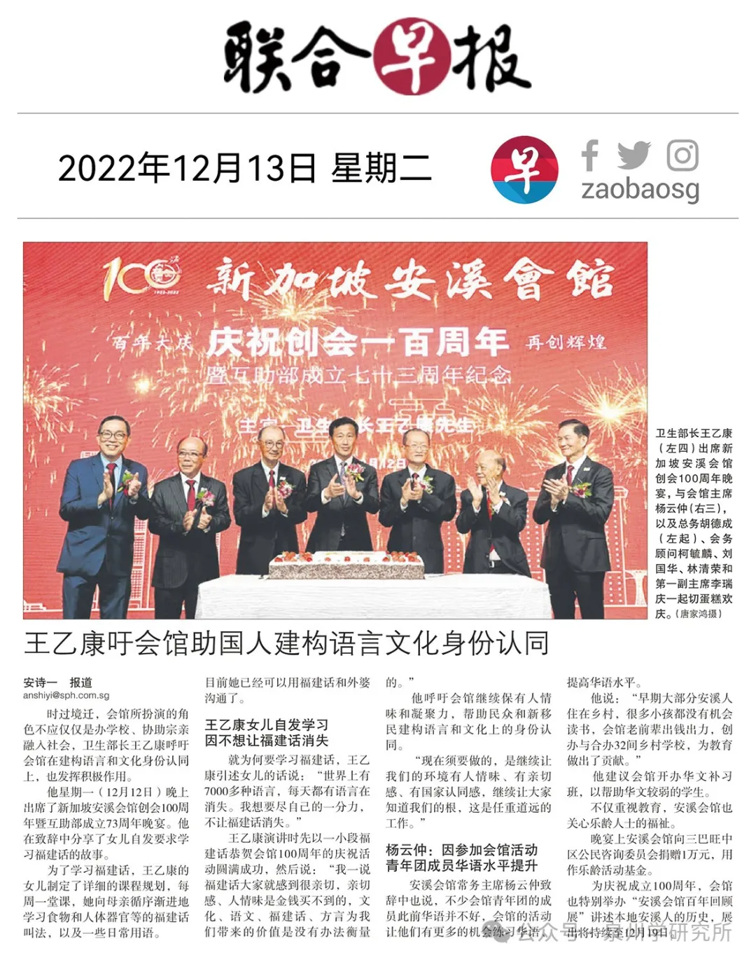 东南亚华人十分重视文化传承,深知语言是文化的载体;不忘来处首先就要不忘母语。2012年,新加坡安溪会馆90周年大庆之际,就曾经专程邀请笔者在牛车水(Chinatown)做“闽南语专题演讲”。在2022年安溪会馆百年庆典之时,出席大庆的新加坡王乙康部长呼吁:建构语言文化身份认同,传续福建话(闽南话),让大家知道自己的根。(下图是新加坡《联合早报》的报道)。