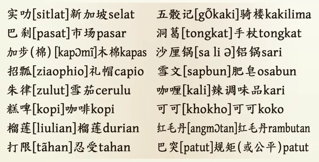 马来西亚的闽南语借词:(以下例子顺序:闽南话-马来语)