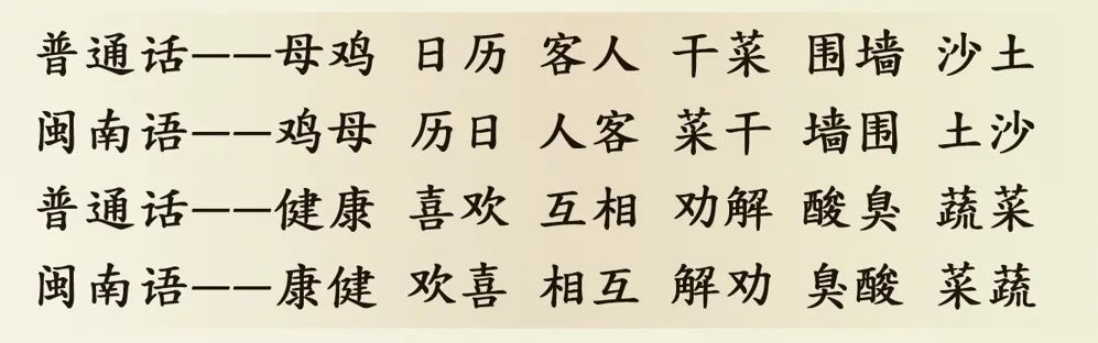 在闽南话中,有一批词与普通话的顺序正好相反。例如: