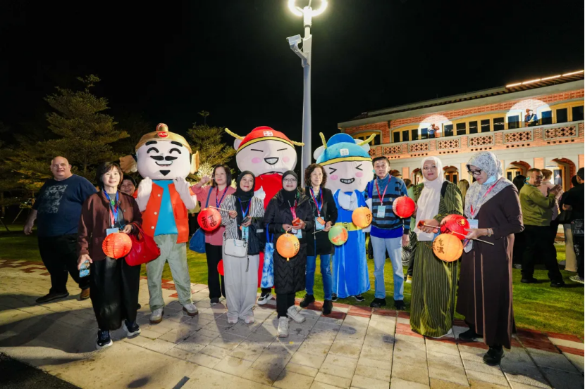 活动当晚的金沙书院灯火璀璨,热闹非凡。手提宫灯、身着汉服的礼仪人员沿途引导,“状元郎”与“成功哥”夹道欢迎,让国际嘉宾一步入会场,便感受到厦门的热情好客。合影打卡区的同心圆造型内嵌厦门标志性建筑元素,楼梯区的“I LOVE XIAMEN”字样与城市地标造型相映成趣,海浪、白鹭等元素点缀其间,尽显滨海城市的独特韵味。