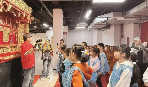 活动现场,非遗代表性传承人率先带领孩子们走进馆藏木偶精品区,一个个造型精致、神态各异的木偶与皮影瞬间吸引了孩子们的目光。老师们以生动幽默的语言,将布袋木偶戏的悠久历史与文化内涵娓娓道来。这项源于晋代、兴盛于宋代、鼎盛于明代的传统艺术,是闽南地区极具代表性的傀儡戏表演形式,因表演者以手掌为偶人躯干,凭食指托头、拇指与其余三指操控双臂,故又名“掌中戏”。