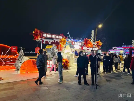 市民游客在和平码头拍照打卡,排队等待登上跨年的游船(央广网记者 吴馨骅 摄)