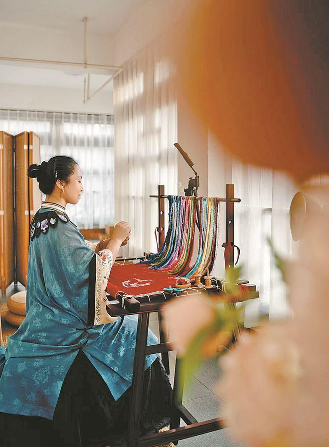 每天工作室的客人走了后,就是李玉兰的“独处时间”——她坐在绣绷前,指尖捻着桑蚕丝线,银针在锦缎上下穿梭。