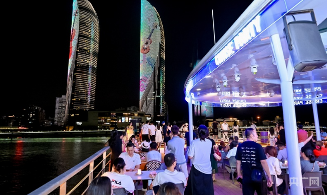 游客在屿见66甲板上欣赏厦门夜景(央广网记者 邬眉 摄)