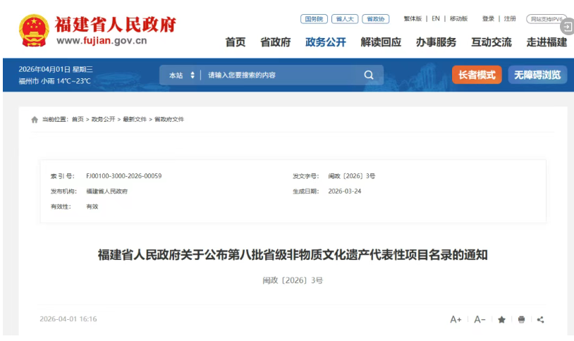 近日福建省人民政府公布了第八批省级非物质文化遗产代表性项目名录